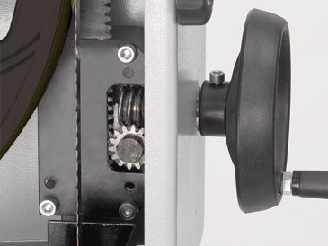 Solid double trunnion table mount for rigid table support featuring one handed rack and pinion table tilt for ease of use and accuracy. Mounted on top of bandwheel box with jacking screws for easy adjustment.