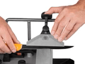 When you mount your knife in the KJ-140 Wide Centering Knife Jig, the knife self-centers in the jig, whatever its thickness or geometry. This means that the jig centers everything from the thinnest knives to knives with a blade thickness of up to 10 mm (7/16"). It also means that knife blades that taper off from spine to edge and heel to tip are centered in the jig, providing symmetrical bevels on both sides of the blade. Easy setup, perfect results.